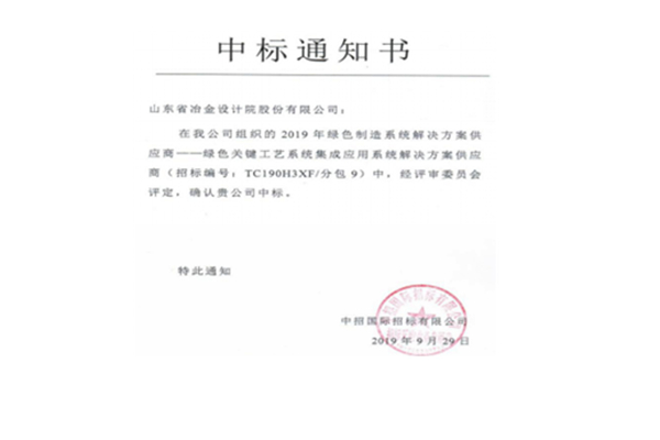 近日,在中華人民共和國(guó)工業(yè)和信息化部節(jié)能與綜合利用司2019年綠色制造系統(tǒng)解決方案供應(yīng)商招標(biāo)中,公司中標(biāo)綠色關(guān)鍵工藝系統(tǒng)集成應(yīng)用系統(tǒng)解決方案供應(yīng)商。