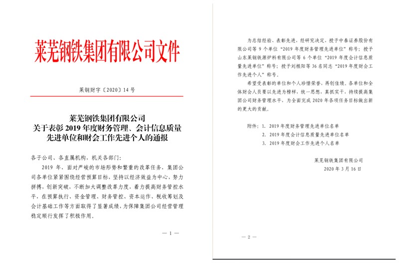 2020316日,萊鋼集團下發“關于表彰2019年度財務管理、會計信息質量先進單位和財會工作先進個人的通報”,山冶設計榮獲“2019年度財務管理先進單位”稱號,創研公司榮獲“2019年度會計信息質量先進單位”稱號,山冶設計財務部萬同輝、創研公司財務部薛云榮獲“2019年度財會工作先進個人”稱號。