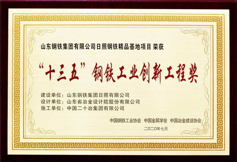 2020年7月31日,中國鋼鐵工業(yè)“十三五”科技創(chuàng)新成果展暨頒獎典禮在江蘇張家港舉行,由山冶設(shè)計總體規(guī)劃設(shè)計的山東鋼鐵集團有限公司日照鋼鐵精品基地項目,榮獲“十三五”鋼鐵工業(yè)創(chuàng)新工程獎。公司董事長魏新民參加了頒獎大會并上臺領(lǐng)獎。
