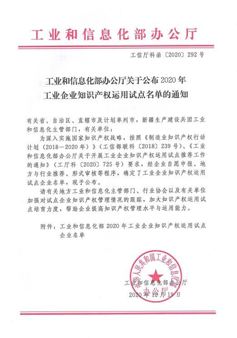 日前,國家工業(yè)和信息化部辦公廳發(fā)文公布,公司成功入選“2020年工業(yè)企業(yè)知識(shí)產(chǎn)權(quán)運(yùn)用試點(diǎn)單位”,山東省共入選109家知識(shí)產(chǎn)權(quán)運(yùn)用優(yōu)秀企業(yè)。