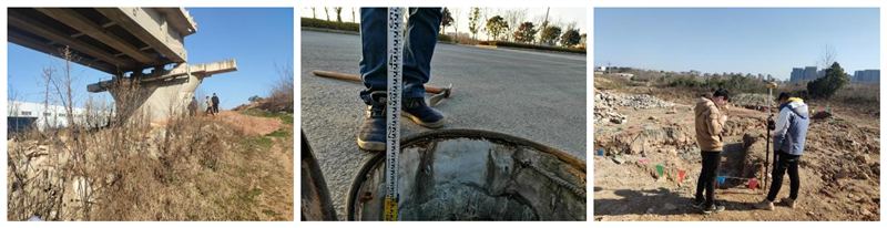 本次現場實測數據包含現狀鐵路橋橋墩坐標、橋梁凈空,已建設道路交叉口坐標及高程,已施工雨、污水井坐標及井深等,測量項目涉及到“陽邏之心”50多萬平方米二十余條道路,測量范圍廣闊,測量目標眾多,而測量人員僅為王學皓、吳修業及二十冶測量技術員陳工,實測任務異常艱巨?,F場多為半施工或未施工道路,測量情況十分復雜,并同時遭遇武漢強降溫天氣,踏勘工作面臨極大考驗。尤其在雨污水井數據測量方面,部分道路車流量較大,需搭設臨時圍擋保證測量安全;部分重型井蓋受重載車輛碾壓密實變形,現有工具簡陋,僅打開井蓋這一項往往需要數十分鐘,完成單個井數據測量至少需要一個多小時,遠遠超出預估時間。與時間節點競速,測量人員踏霜踩露而出,披星戴月而歸,歷經四天全力以赴、克難攻堅,圓滿完成所有測量任務,為設計工作順利進行提供了有力的數據支持。